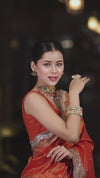 Banarasee Handloom Dual Tone Shimmer Tissue Saree With Buti Design Zari Border & Lace-Rust
