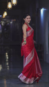 Banarasee Handloom Georgette Saree With Silver Zari Work & Contrast Border-Cream & Red