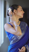 Banarasee Handwoven Plain Semi Silk Saree With Silver Zari Border-Cobalt Blue